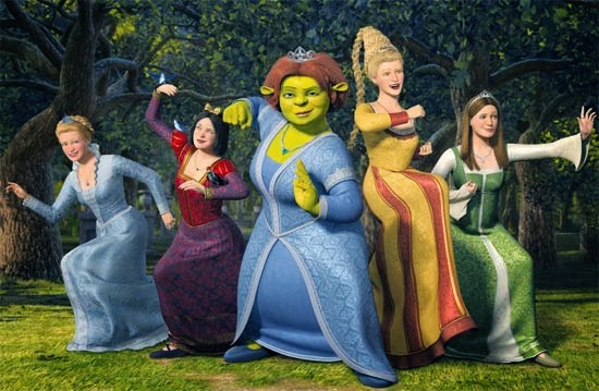 They proceed to try to rescue Shrek by breaking in to the castle. Snow White distracts the guards by singing a soothing song while all the forest animals gather around her. Once she has lulled them into a trance, she quickly changes her tune to Led Zepplin’s “Immigrant Song” and instructs the forest animals to attack the tree guards. The other princesses proceeds to use their stereotypical femininity to break into the castle. Cinderella uses her glass slipper (which has never been a slipper but is a high heel) as a boomerang, Sleeping Beauty pretends to fall asleep in front of some of the guards and trips them, and even the “Ugly Stepsister” joins in by showing off her legs to distract more guards before she punches them. As a feminist these scenes made me giddy. I was like “YES! Finally some images of strong capable girls/women”. Unfortunately, this portrayal of princesses is one of a kind.